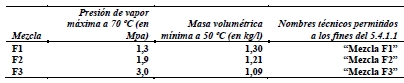 274 Se aplican las disposiciones del 3.1.2.8. 582 Este apartado comprende, entre otras, las mezclas de gas indicadas por “R…” que tengan las propiedades siguientes: NOTA 1: El triclorofluorometano (refrigerante R11), el tricloro-1,1,2 trifluoro-1,2,2 etano (refrigerante R113), el tricloro-1,1,1 trifluoro-2,2,2 etano (refrigerante R113a), el cloro-1 trifluoro-1,2,2 etano (Refrigerante R133) y el cloro-1 trifuoro-1,1,2 etano (Refrigerante R133b) no son materias de la clase 2. No obstante podrán entrar en la composición de las mezclas F1 a F3. NOTA 2: La masa volumétrica de referencia corresponde a las del diclorofluorometano (1,30 kg/l), diclorodifluorometano (1,21 kg/l) y clorodifluorometano (1,09 kg/l) 662 Las botellas conforme a las disposiciones del capítulo 6.2 que sean usadas exclusivamente a bordo de un barco o un avión, pueden ser transportadas con el propósito del relleno o inspección y retorno subsiguiente, siempre que las botellas sean diseñadas y construidas de acuerdo con una norma reconocida por la autoridad competente del país de aprobación y todos las disposiciones correspondientes del ADR se cumplan incluso: a) las botellas serán transportadas con una válvula de protección conforme con 4.1.6.8; b) las botellas serán marcadas y etiquetadas conforme a 5.2.1 y 5.2.2; y c) todos los requisitos correspondientes de relleno de la instrucción de embalaje P200 de 4.1.4.1 serán cumplidos. El documento de transporte incluirá la siguiente declaración “Transporte conforme con la disposición especial 662”.